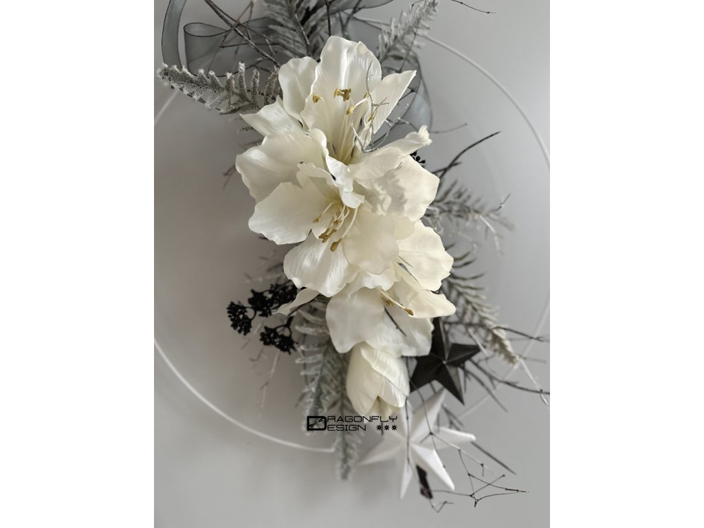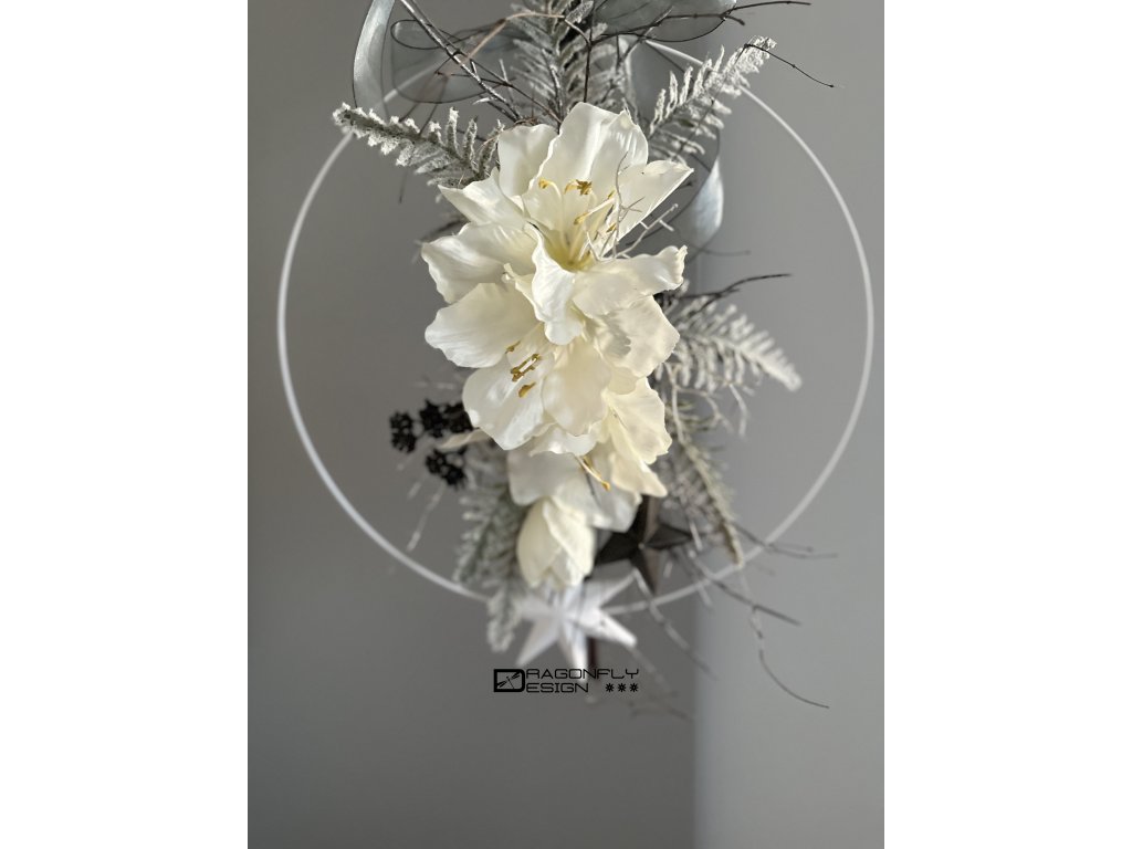 Závěsná dekorace na tenkém kovovém kruhu o průměru 40 cm bílé barvy.