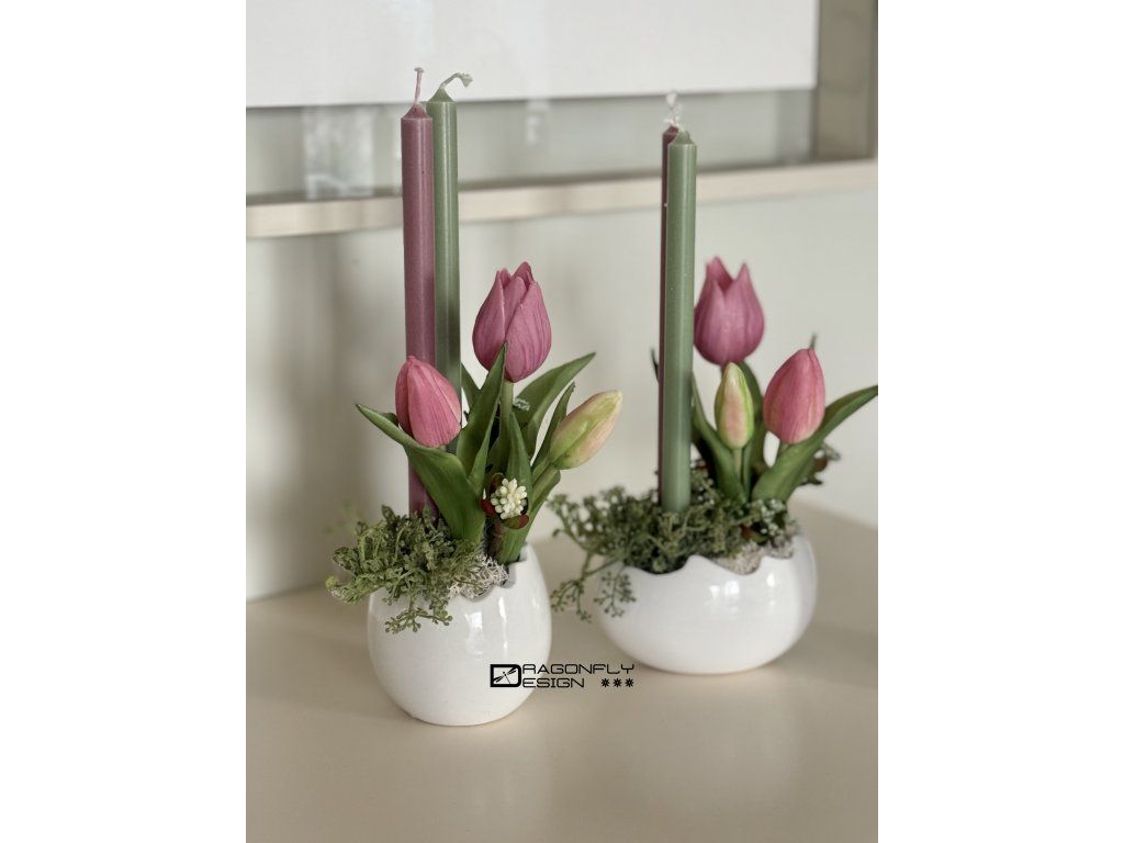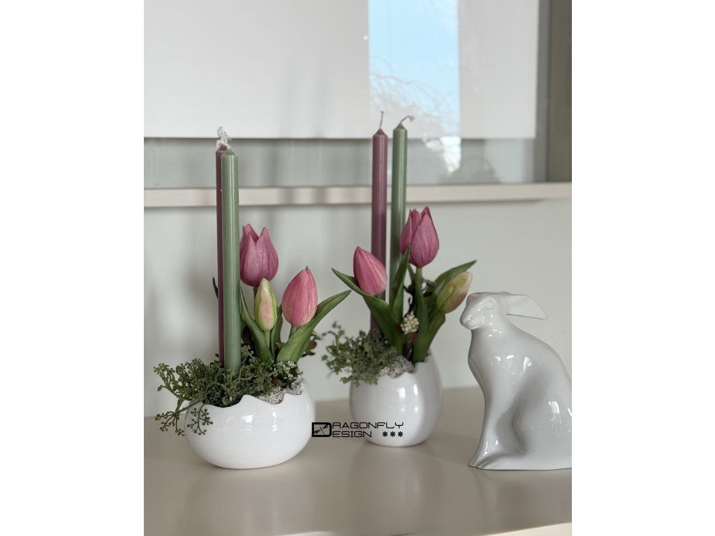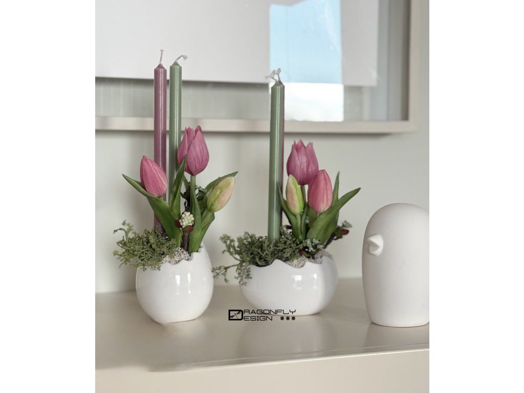 Jarní dekorace v nádobě ve tvaru skořápky s dvěma svíčkami, umělou zelení a silikonovými tulipánky.