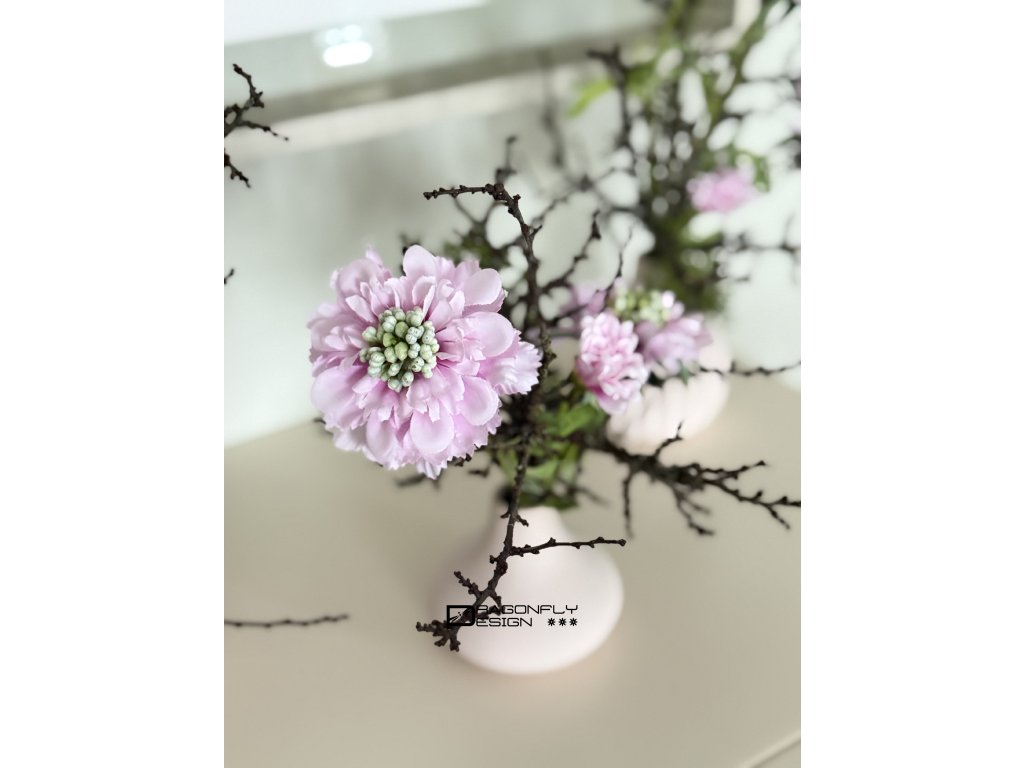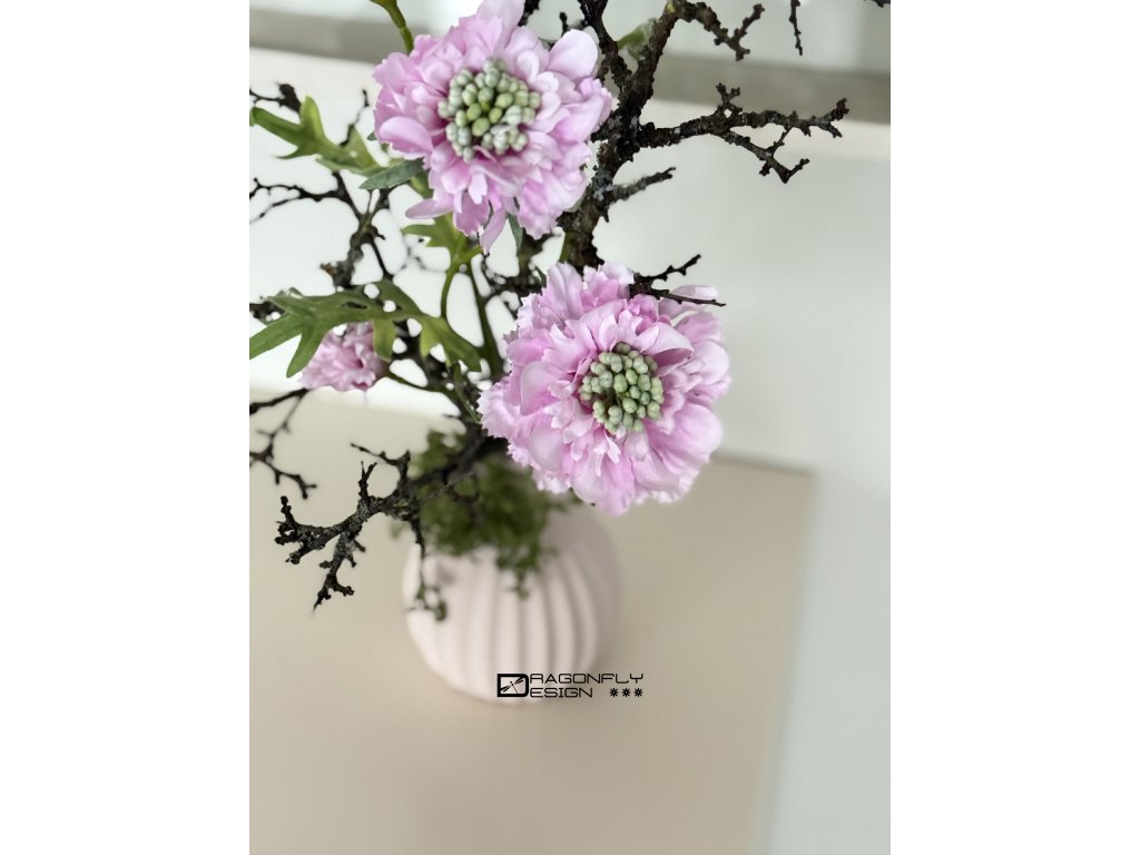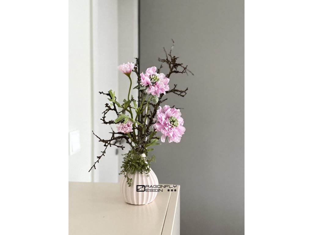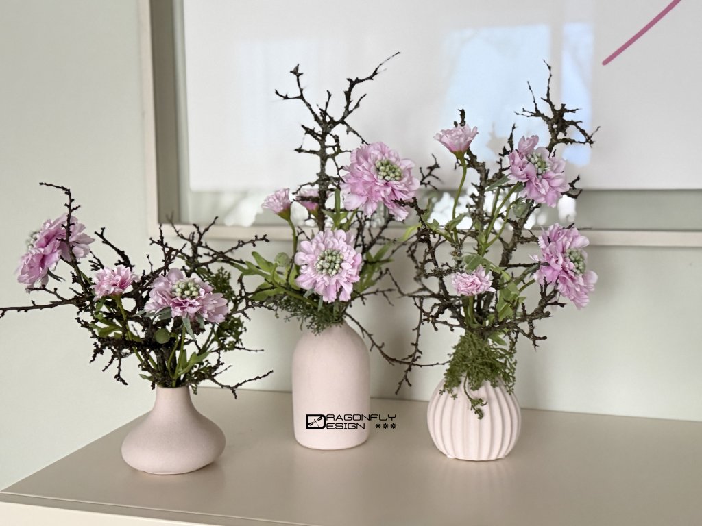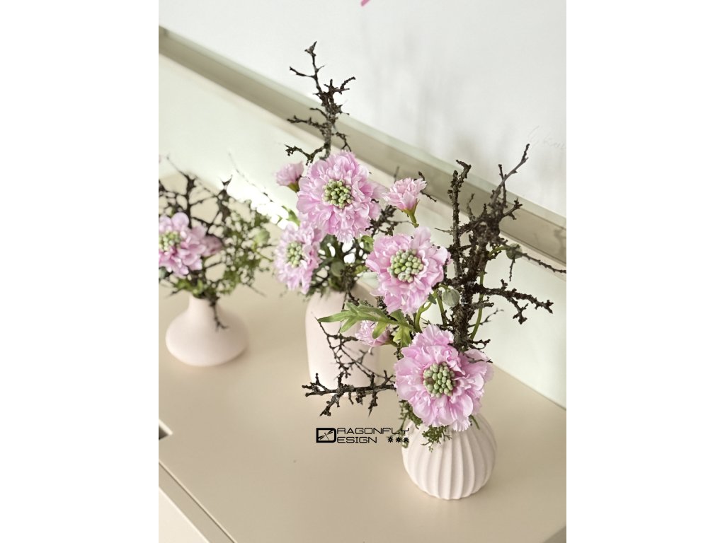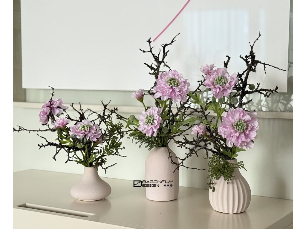 Dekorace, aranžmá v keramických vázičkách hrubého povrchu v matné starorůžové barvě, různých tvarů.