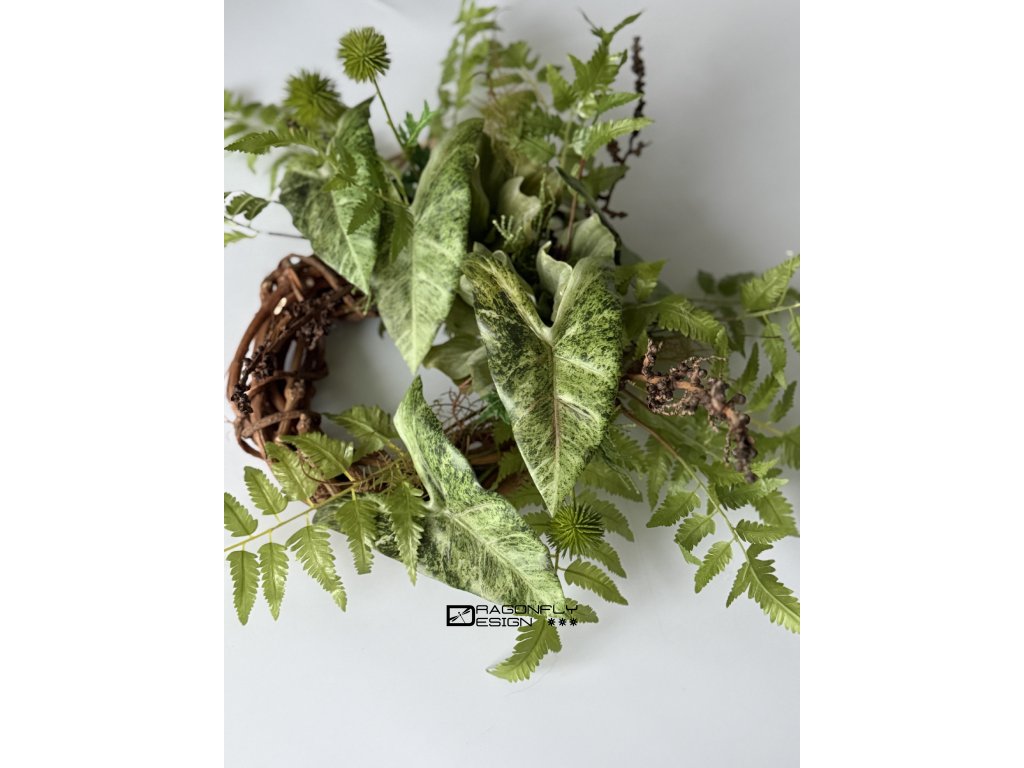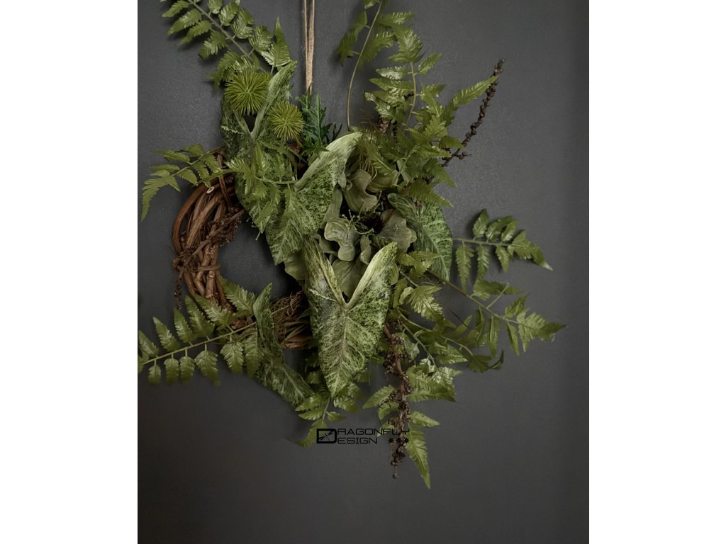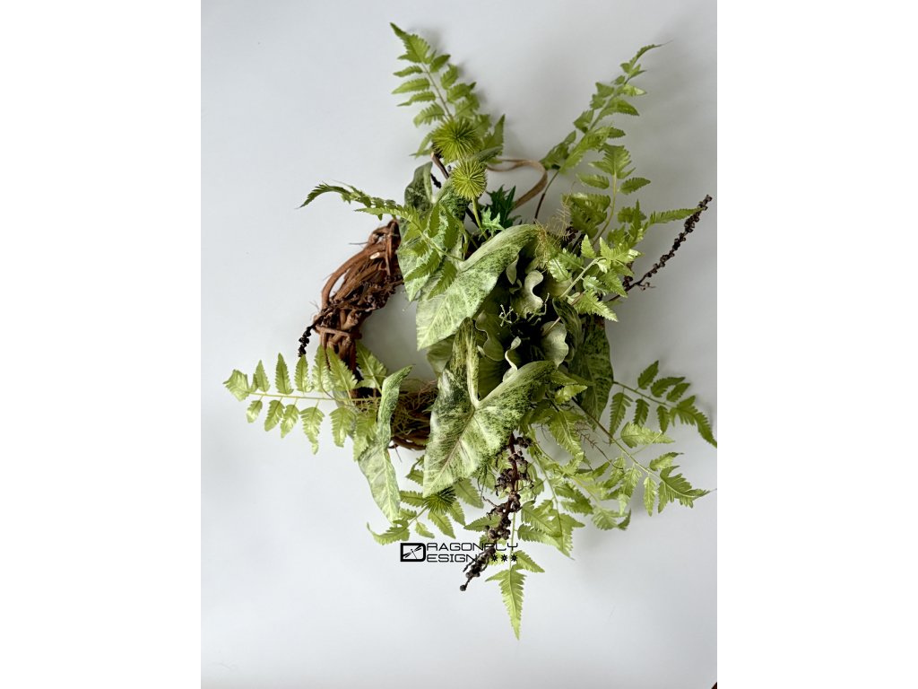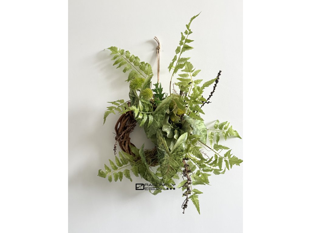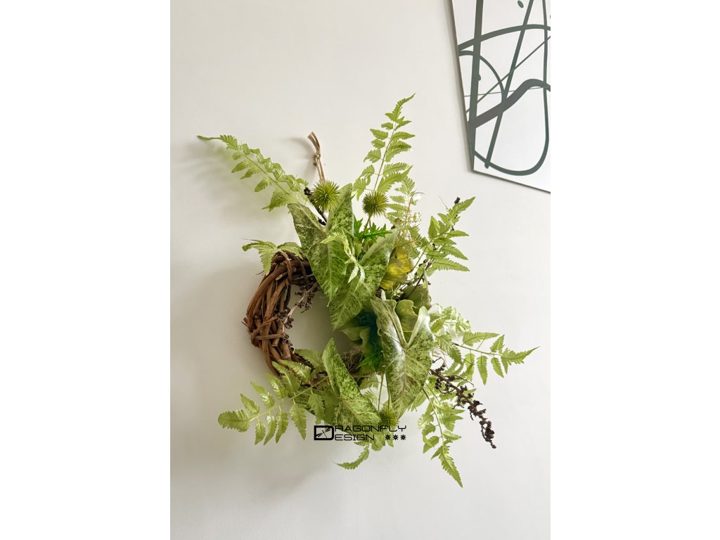 Závěsný nepravidenlý trvanlivý věnec na základě z proutí s množstvím umělé zeleně.