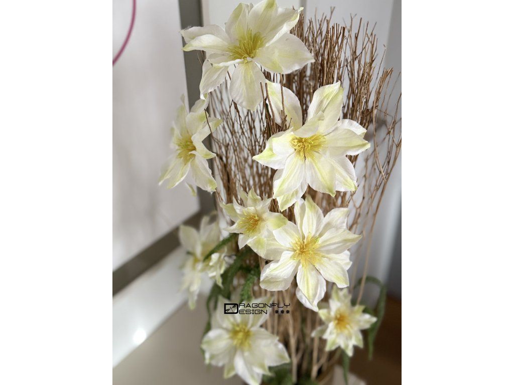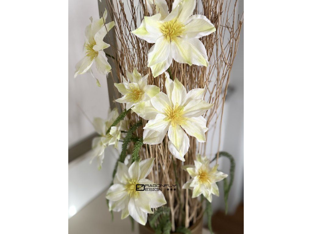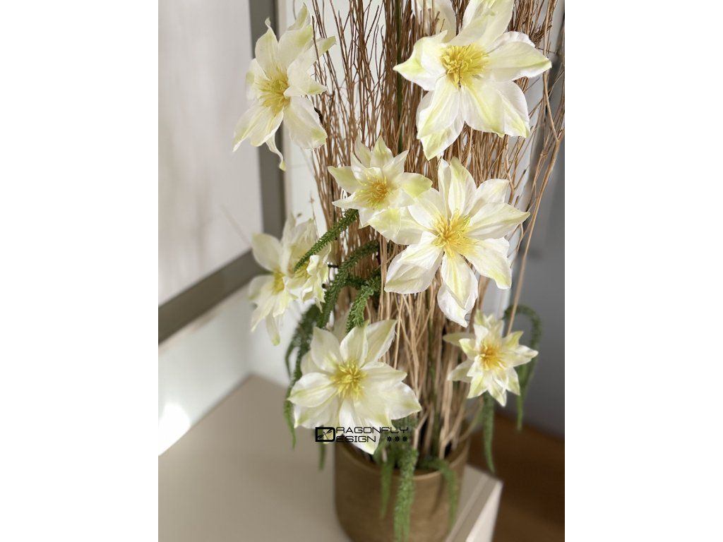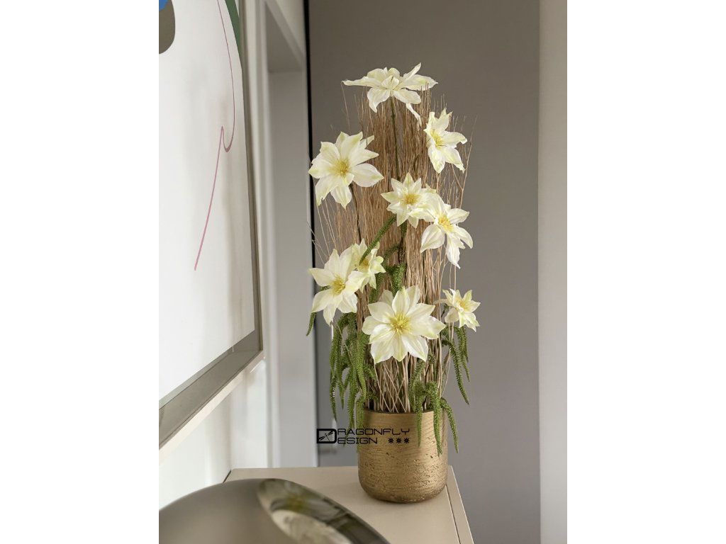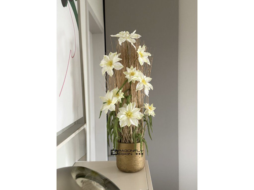 Dekorace ve zlaté nádobě zn. PotteryPots, se sušinou, jejíž konce jsou též barvené na zlato, látkovými květy celematisu a umělou zelení.