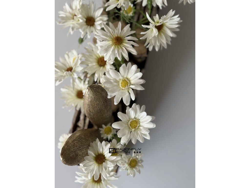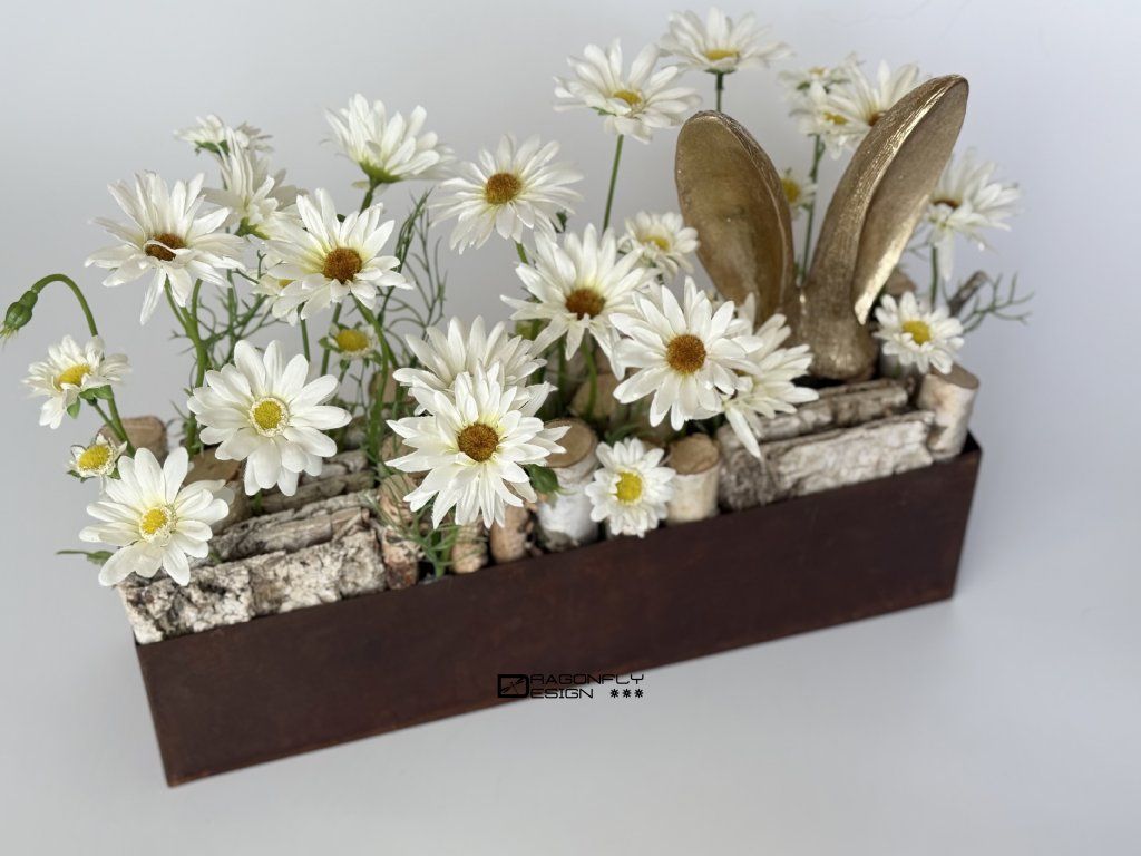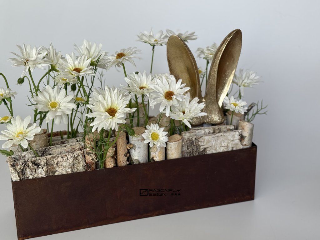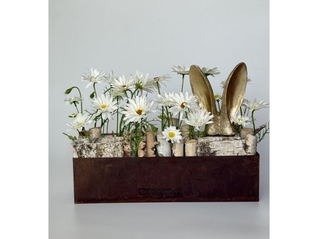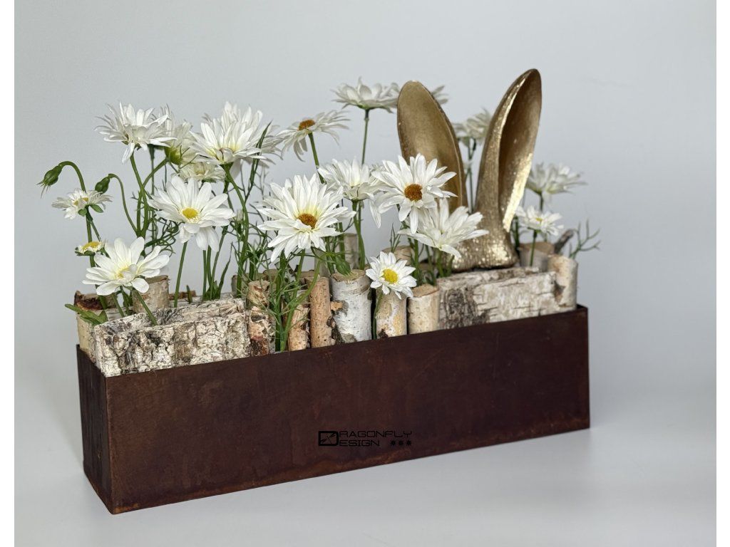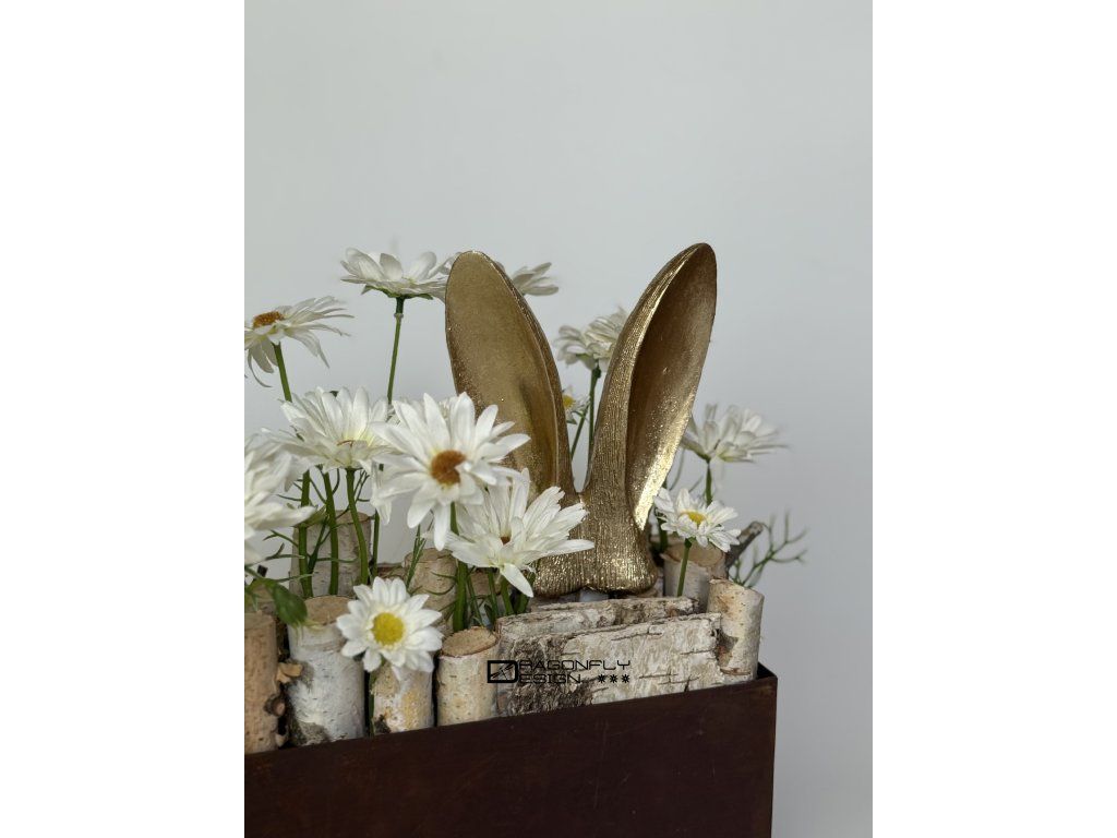 Interierová dekorace v plechovém truhlíku, březové špalíky a kůra, umělé květiny a zlatá ozdoba ve tvaru uší zajíce. Uši lze odstranit.