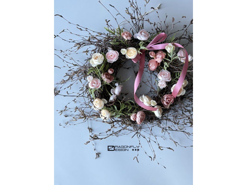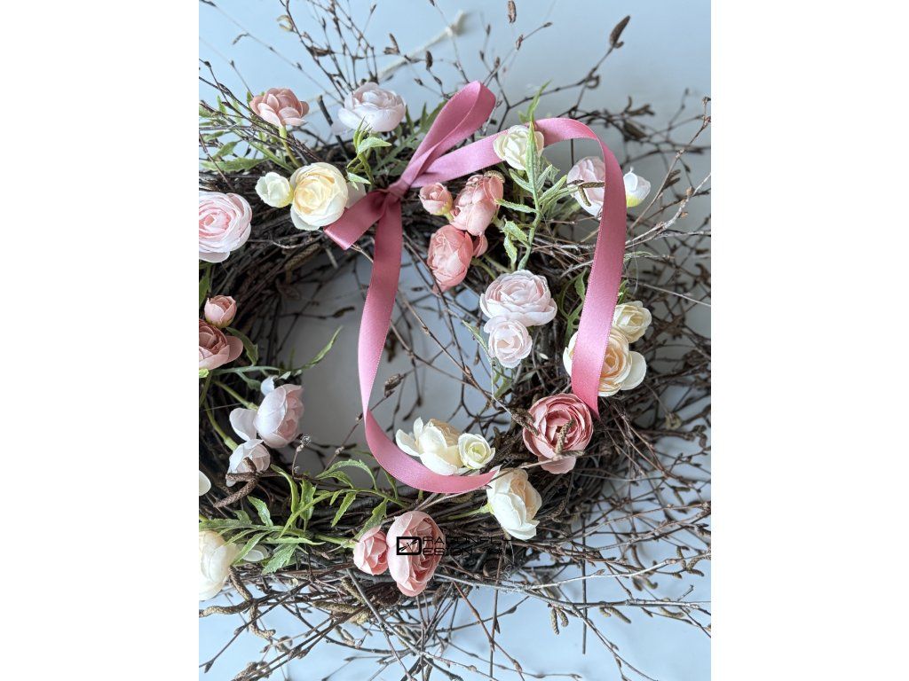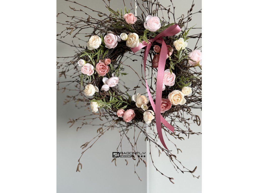 Jarní věnec na proutěném základě z větviček z břízy s umělými kvítky pryskyřníků.