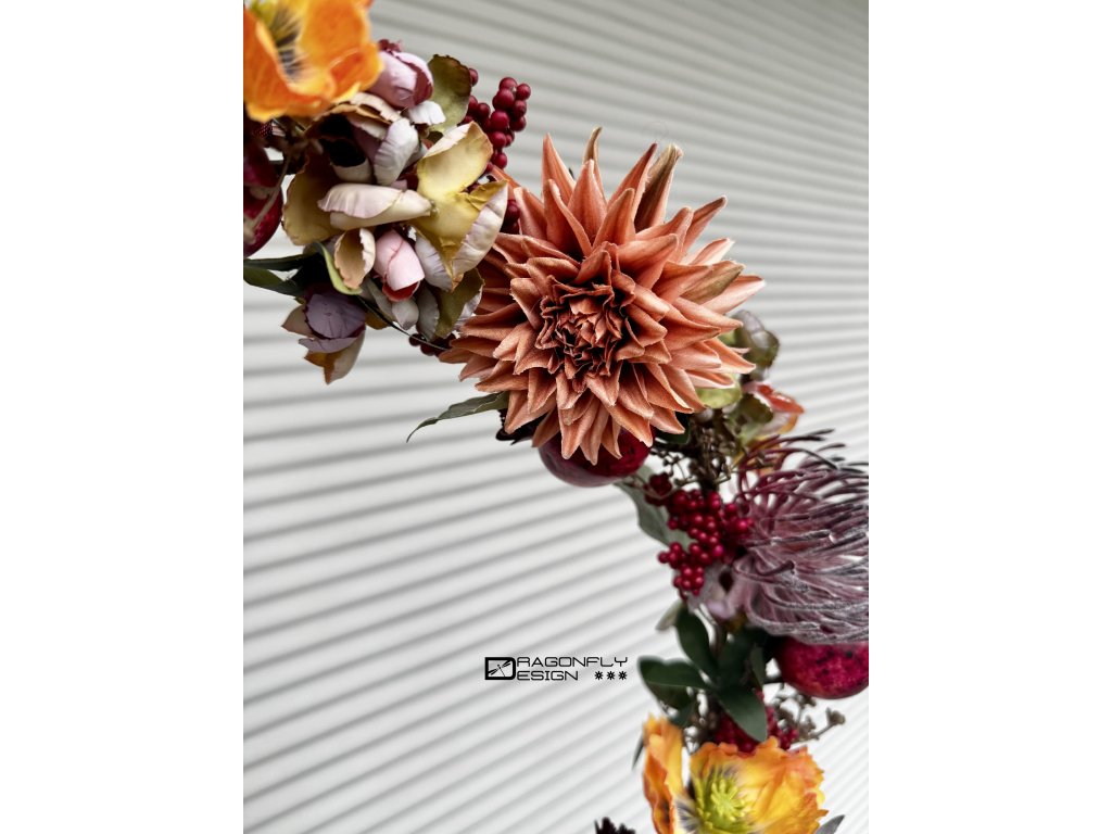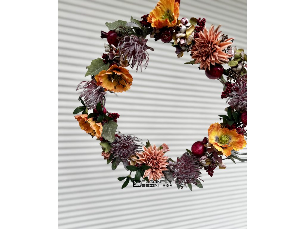 Věnec na kovovém kruhu o průměru 40 cm z různých látkových a umělých podzimních květin a plodů.