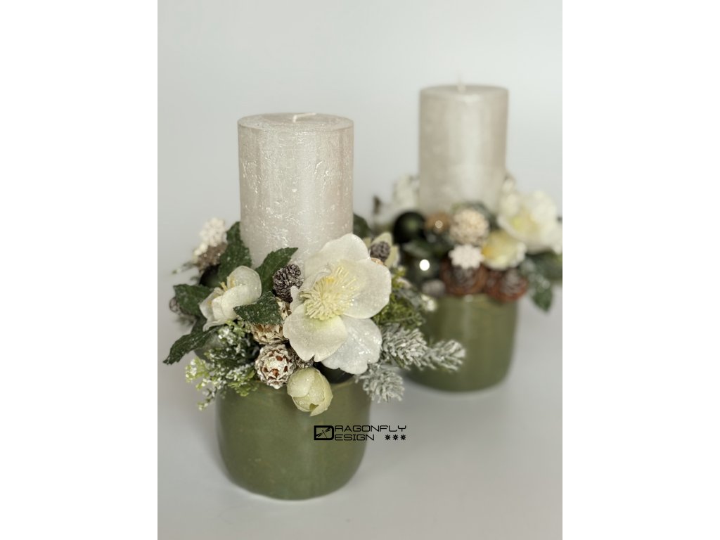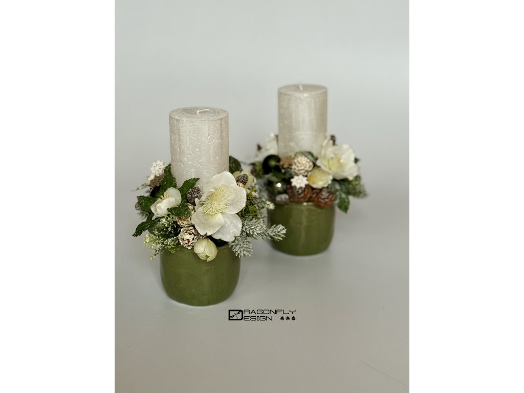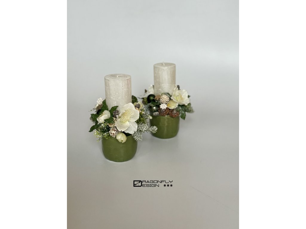 Svícen v keramické nádobce se vzorem, se dvěma různě silnými svíčkami, zdobený přírodninami, stříbřeným pepřem a kovovou ozdobou.