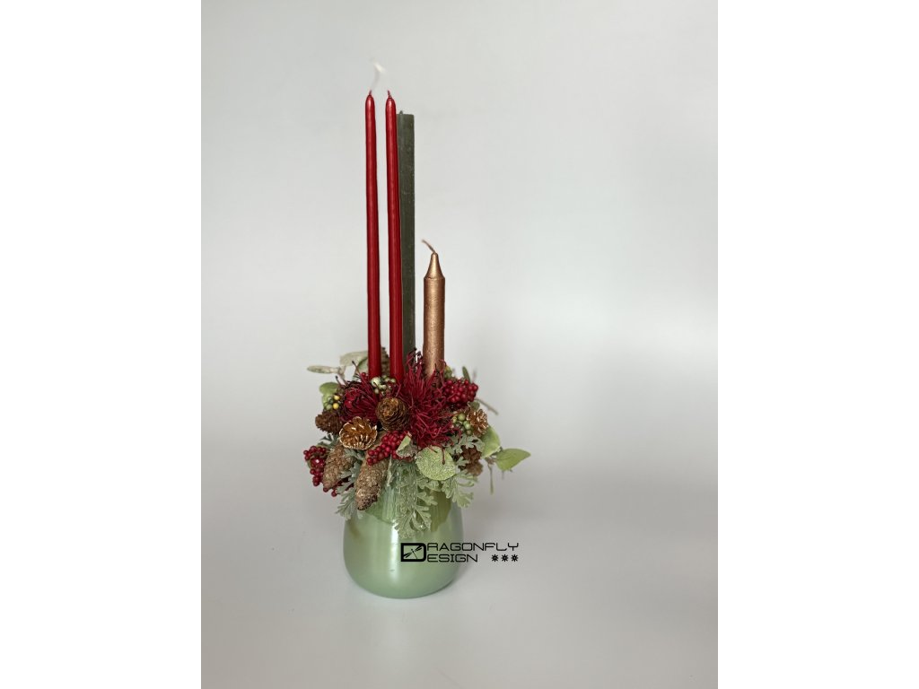 Svícen ve skleněné nádobě, se čtyřmi různě silnými a barevnými svíčkami, zdobený šiškami, umělými květinami, baňkami a bobulkami.