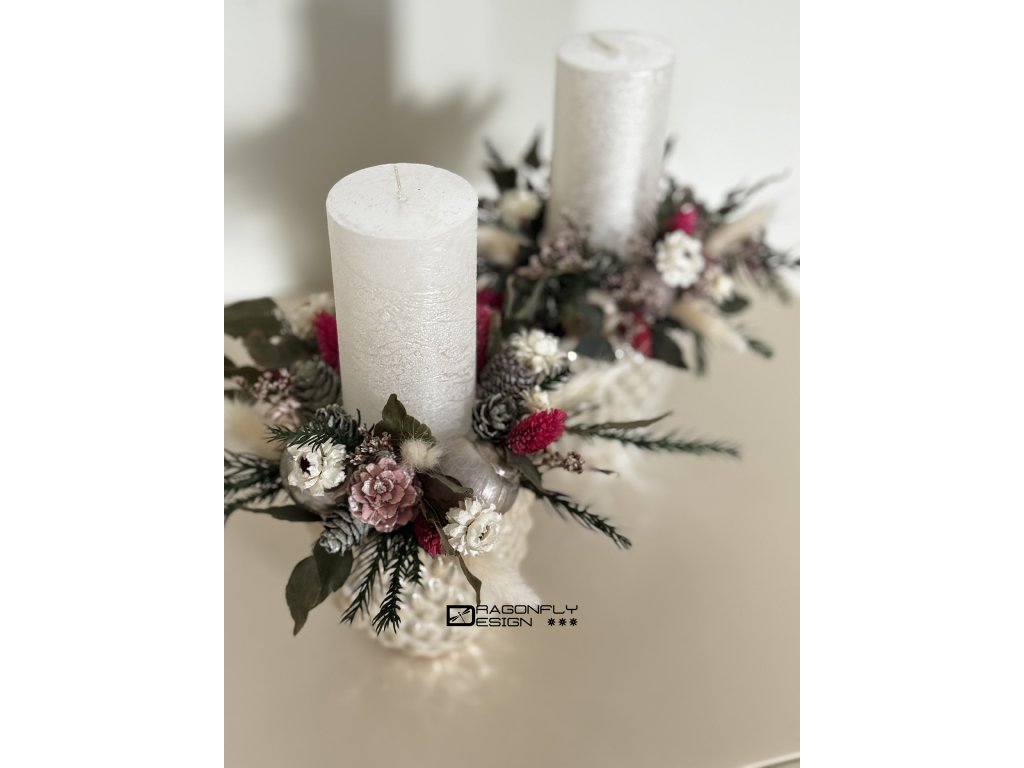 Jemný vánoční svícen v keramické nádobě s perleťovým efektem, s centrální svíčkou, zdobeny ulitami, různými přírodním sušeným a stabilizovaným materiálem a skleněnými baňkami.