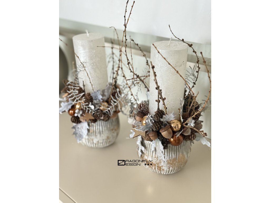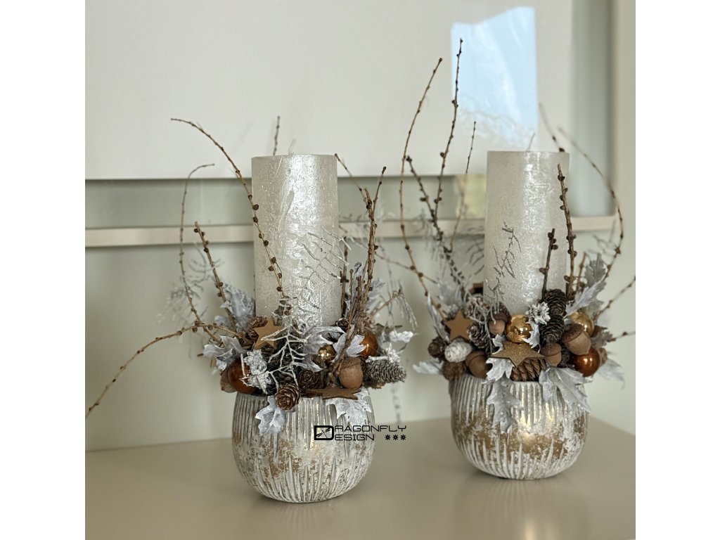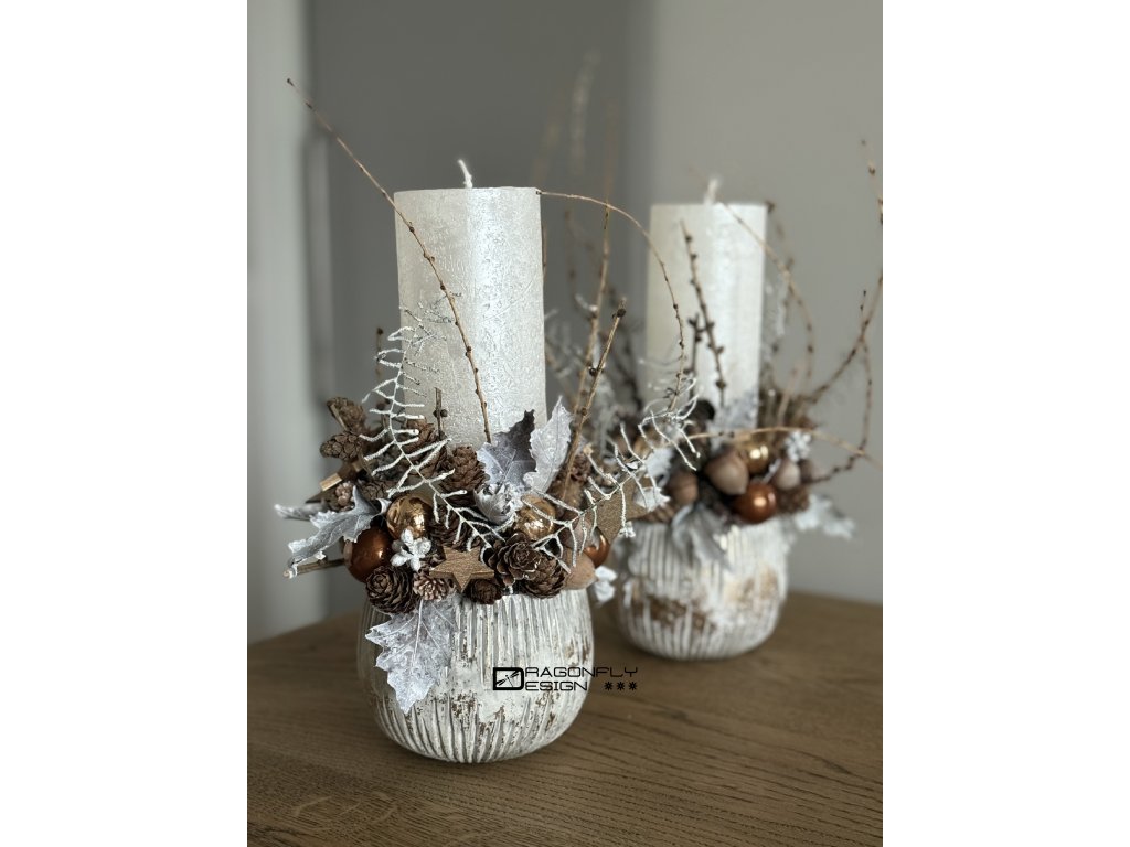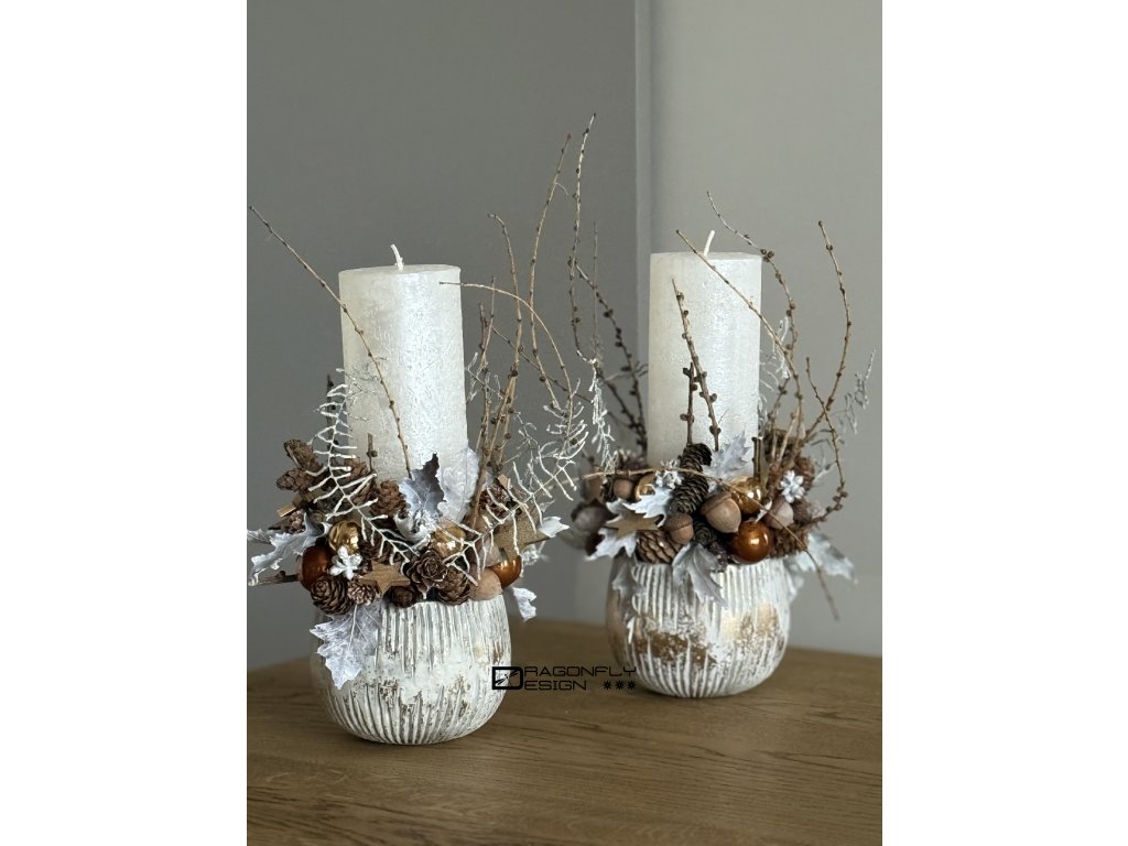 Vánoční svícen v keramické nádobě bílo-zlaté barvy, s centrální velkou svíčkou, zdobený různým přírodním sušeným a stabilizovaným materiálem a skleněnými baňkami.
