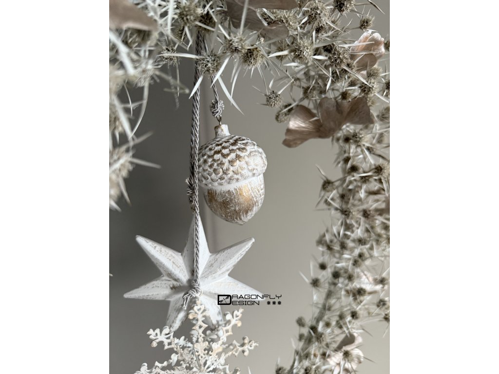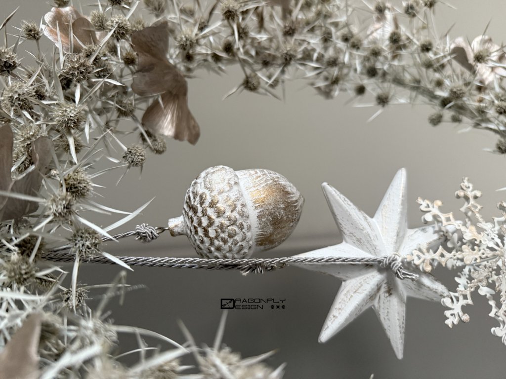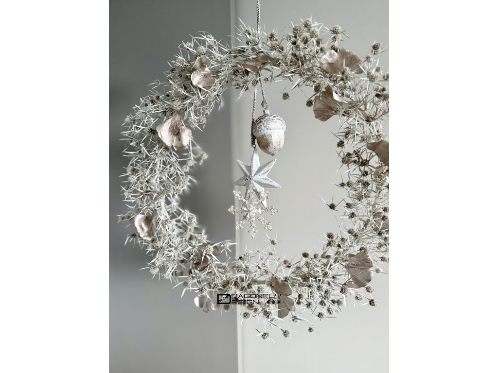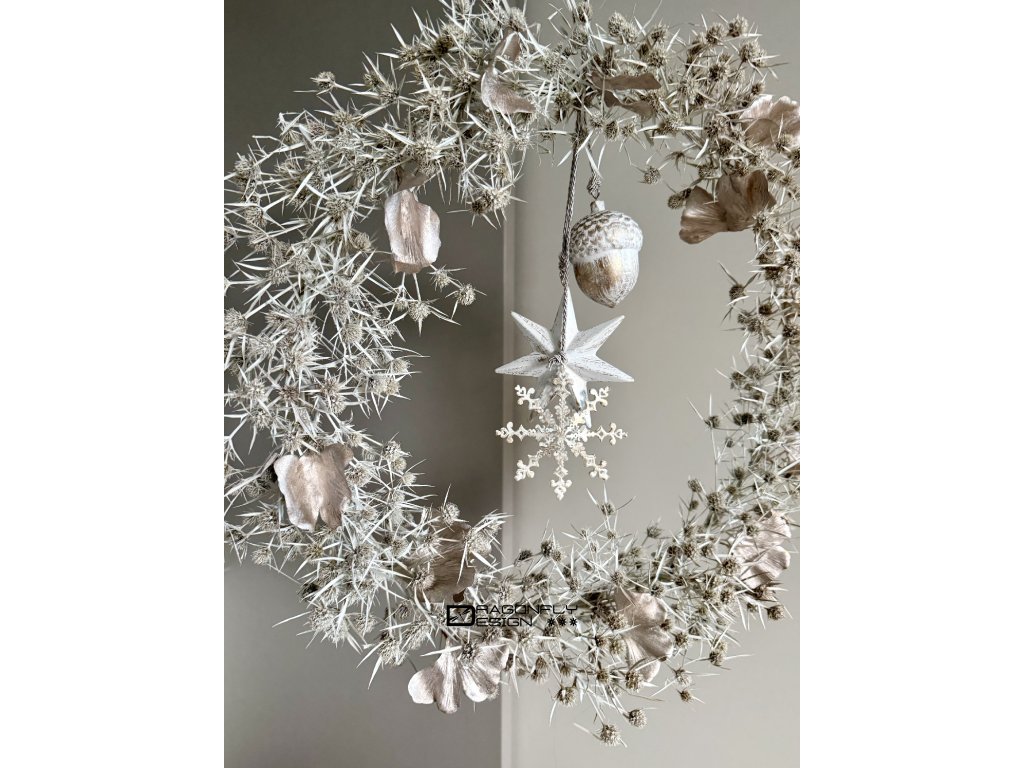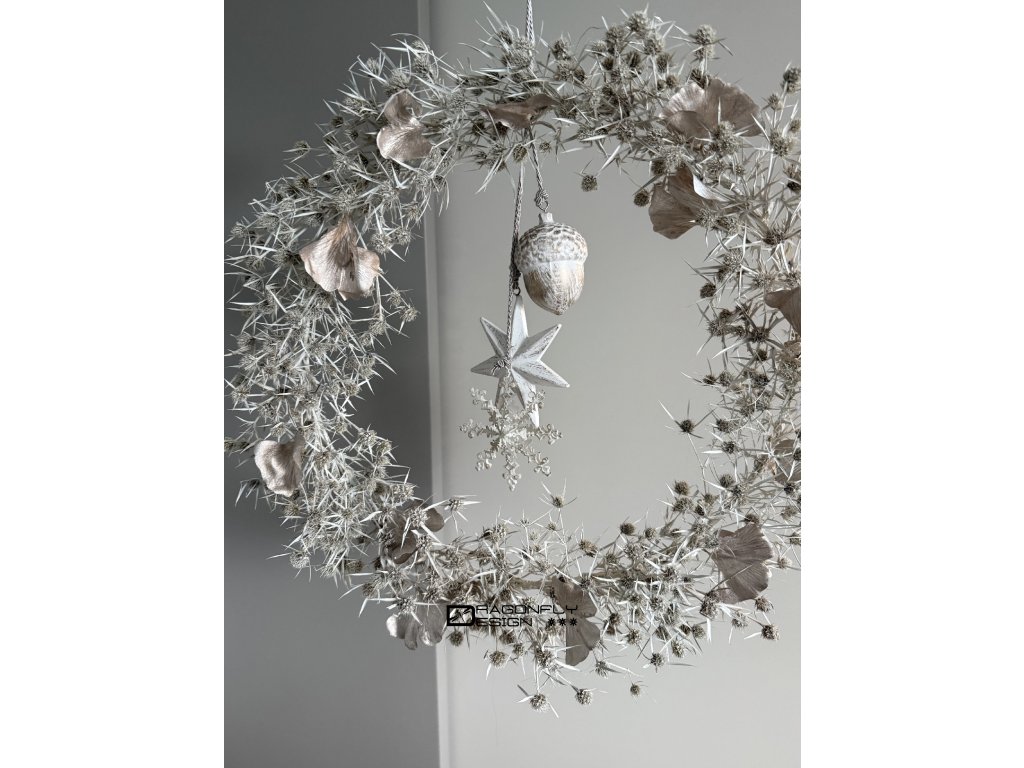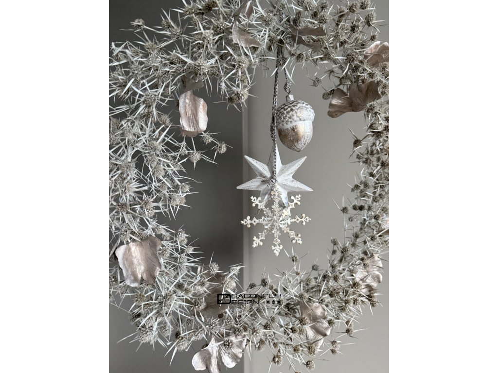 Vánoční závěsný věnec z jemných ovšem ostrých bodláčků, barvených na bílo, zdobený umělými lístky ginko bioloba a vánočními ozdobami.