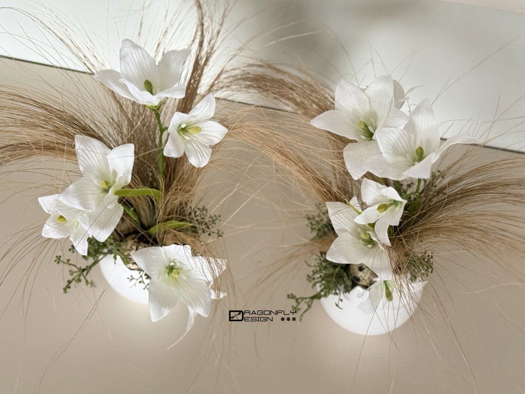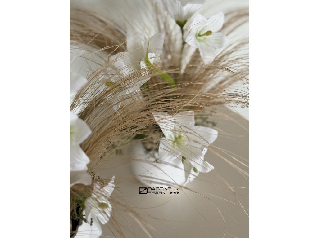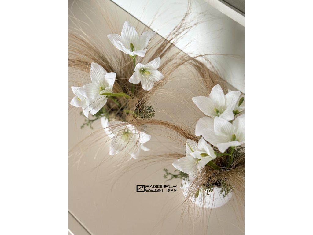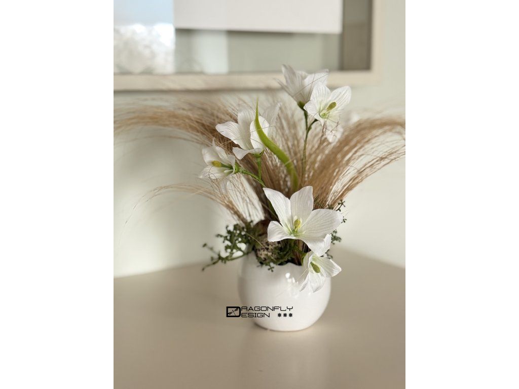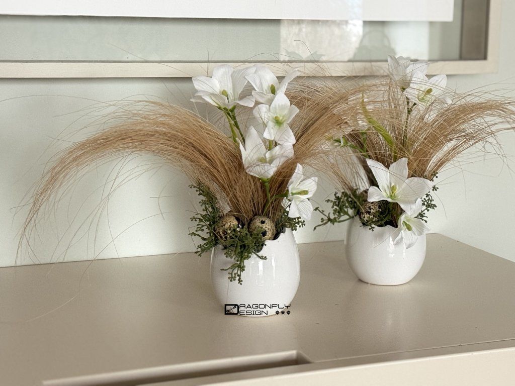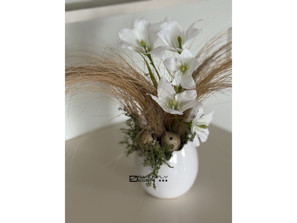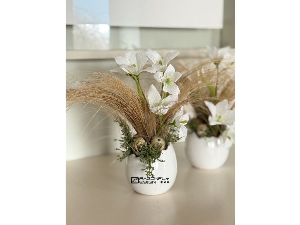 Velikonoční trvanlivá dekorace v keramické nádobce ve tvaru skořápky ... sušená tráva, umělá zeleň, křepelcí vajíčka a bílé látkové kvítky.