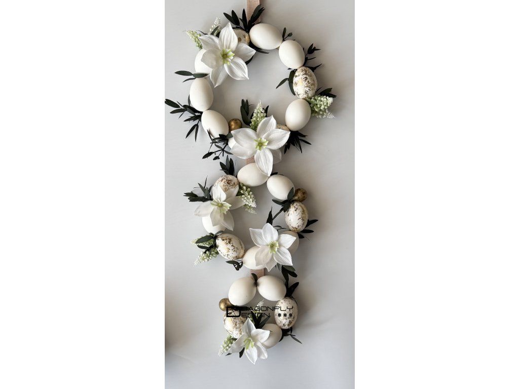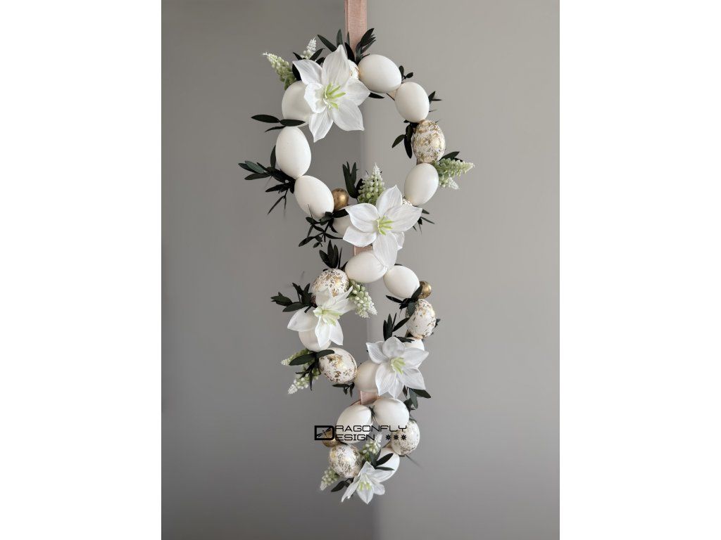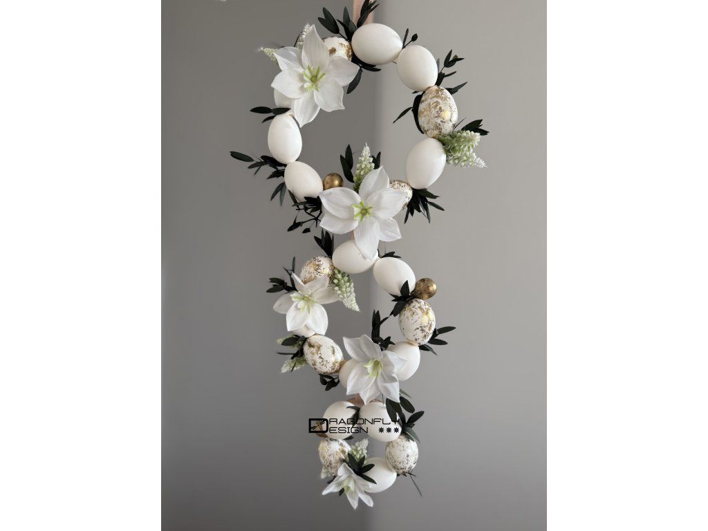 Velikonoční závěsná dekorace z pravých vajíček, umělých květin a stabilizovaného drobného eucalyptu.