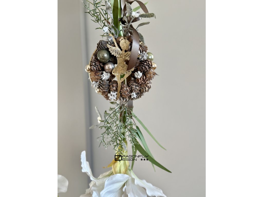 Závěsná vánoční dekorace, látkový amarylis ozdobený věnečkem ze šišek, baňek, umělou zelení a kovovou ozdobou ve tvaru stromku a víly.